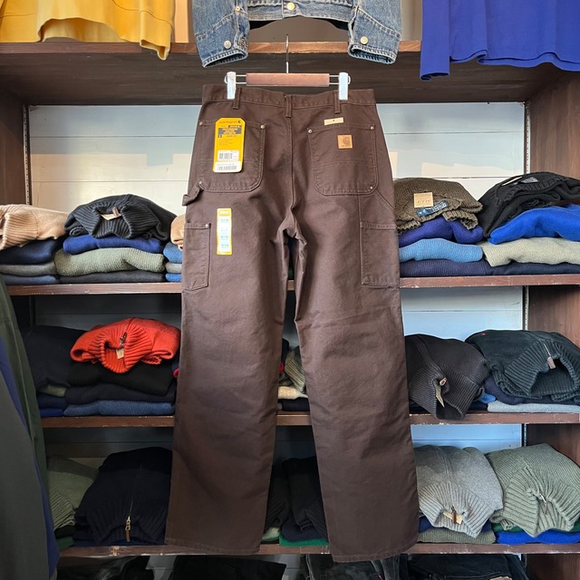 商品番号 b-7039 ・サイズ表記(SIZE) : W34 × L32 実寸 : W34 × L32 ・ウエスト(Waist) :83cm ・レングス(Length) :79cm ・全長 :109cm ・色(COLOR) : Brown ・素材(MATERIAL) : 100% Cotton ・生産国 MADE IN U.S.A. of Inported Parts ・状態(CONDITION) :デッドストック。 画像の通り、目立つダメージや汚れ等なく、生地もしっかりとした状態です。 Carharttを代表する名作、B136 ダブルニーペインターパンツ。 こちらはブランドを象徴するCarhartt Brown(ブラウンダック)カラー、さらに希少なデッドストックの1本です。 同じダブルニーで有名なB01がノンウォッシュ仕様でガシッと硬い生地感なのに対し、B136はウォッシュ加工を施したモデル。 そのため新品時から柔らかく、履きやすさと動きやすさに優れた一本となっています。 膝部分には耐久性を高めるダブルニー仕様、ハンマーループやツールポケットといったワークディテールも健在。 ワークウェアとしてのタフさを備えながら、ストリートやスケートシーンでもファッションアイテムとして高い支持を集めています。 デッドストックならではの濃いブラウンから、これからの着用で自分だけの経年変化を楽しめるのも魅力。 Carharttを象徴する、コレクションにも実用にもおすすめの逸品です。