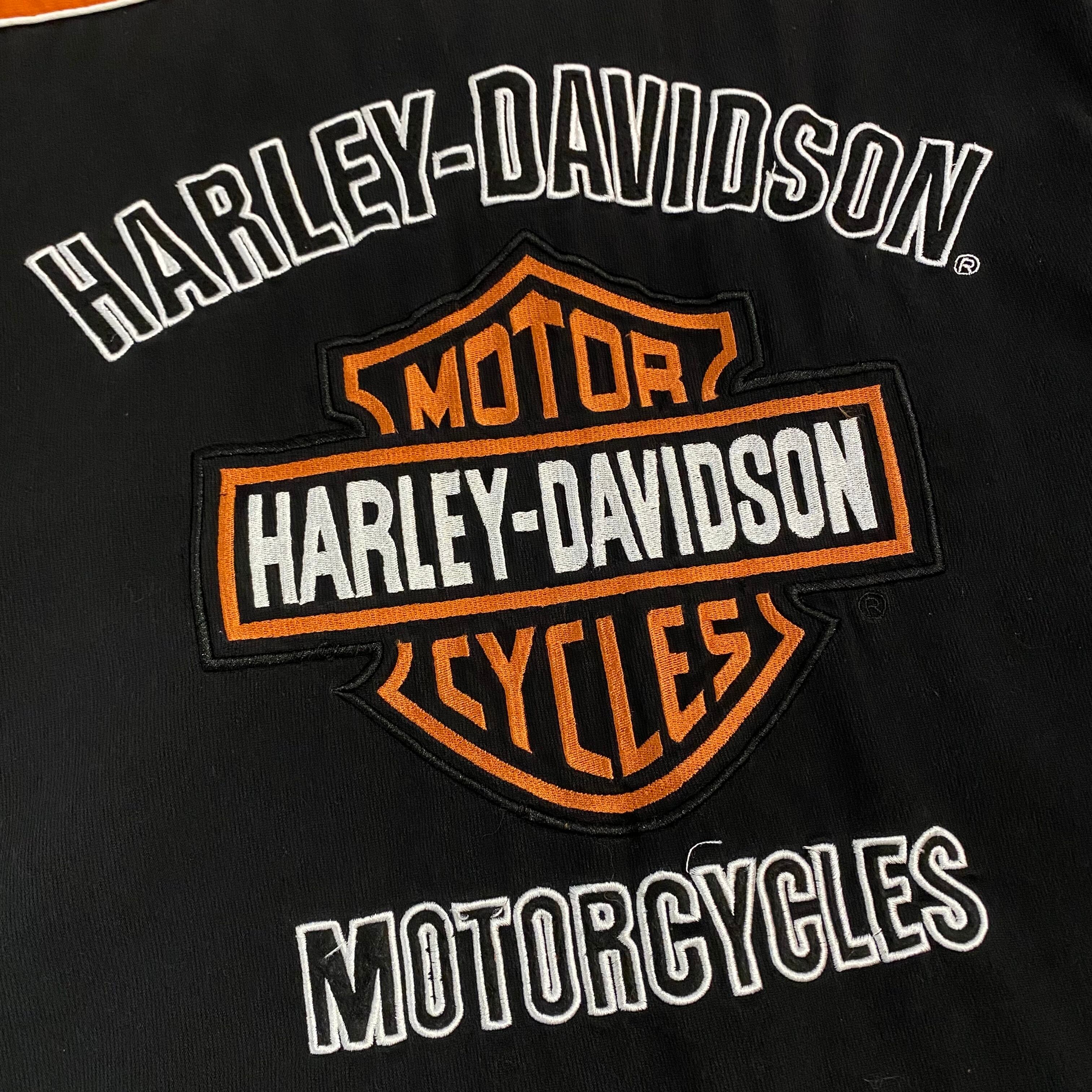 胸元にはブランドロゴの刺繍入り、背中には大判のシールドロゴが大胆にプリントされ、ハーレーらしさ満点の一着です。