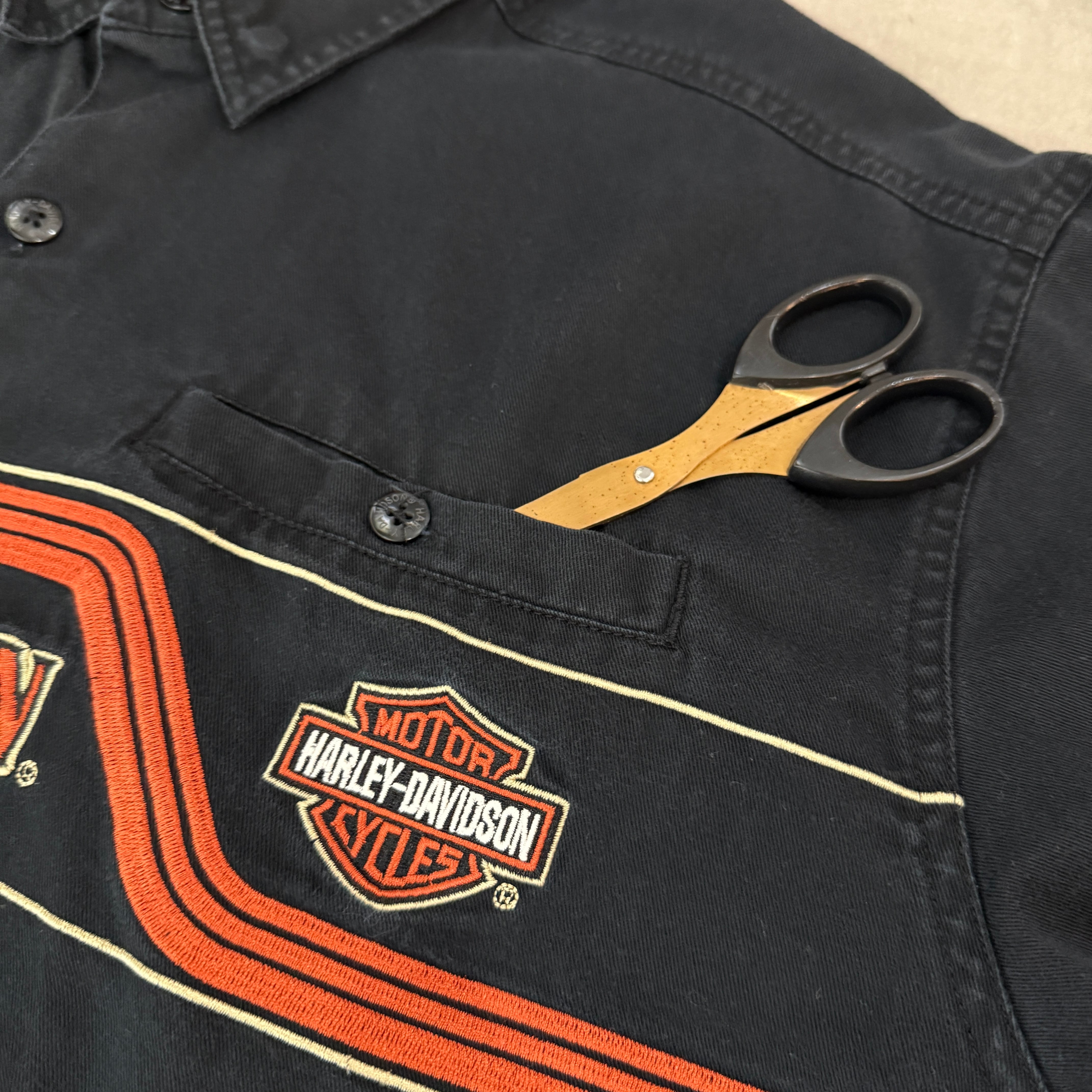 “The ハーレー!!” Harley-Davidson S/S shirt (Black)”size L” ハーレーダビッドソン 半袖シャツ ブラック ロゴ刺繍 古着 古着屋 郡山