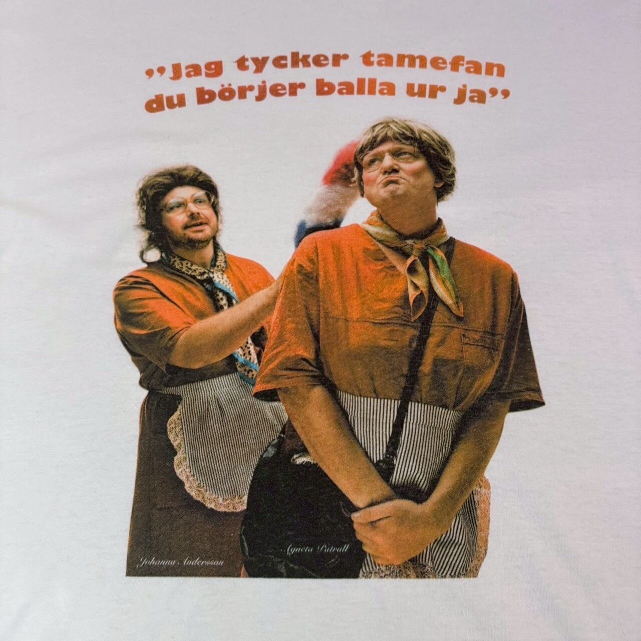 スウェーデン語で「もうあんた、ほんっとヤバい方向に行き始めてるわよ!」といったニュアンスのセリフが大胆にプリントされた一枚!!!