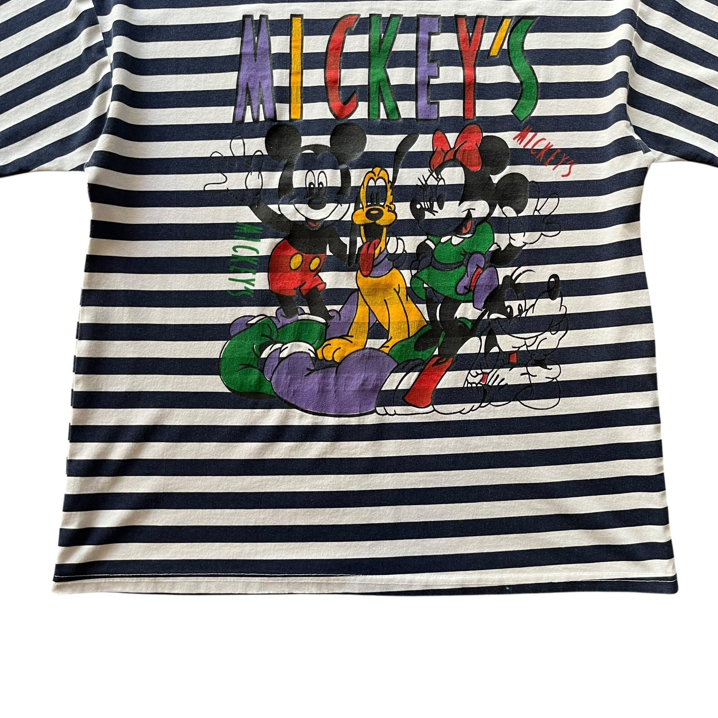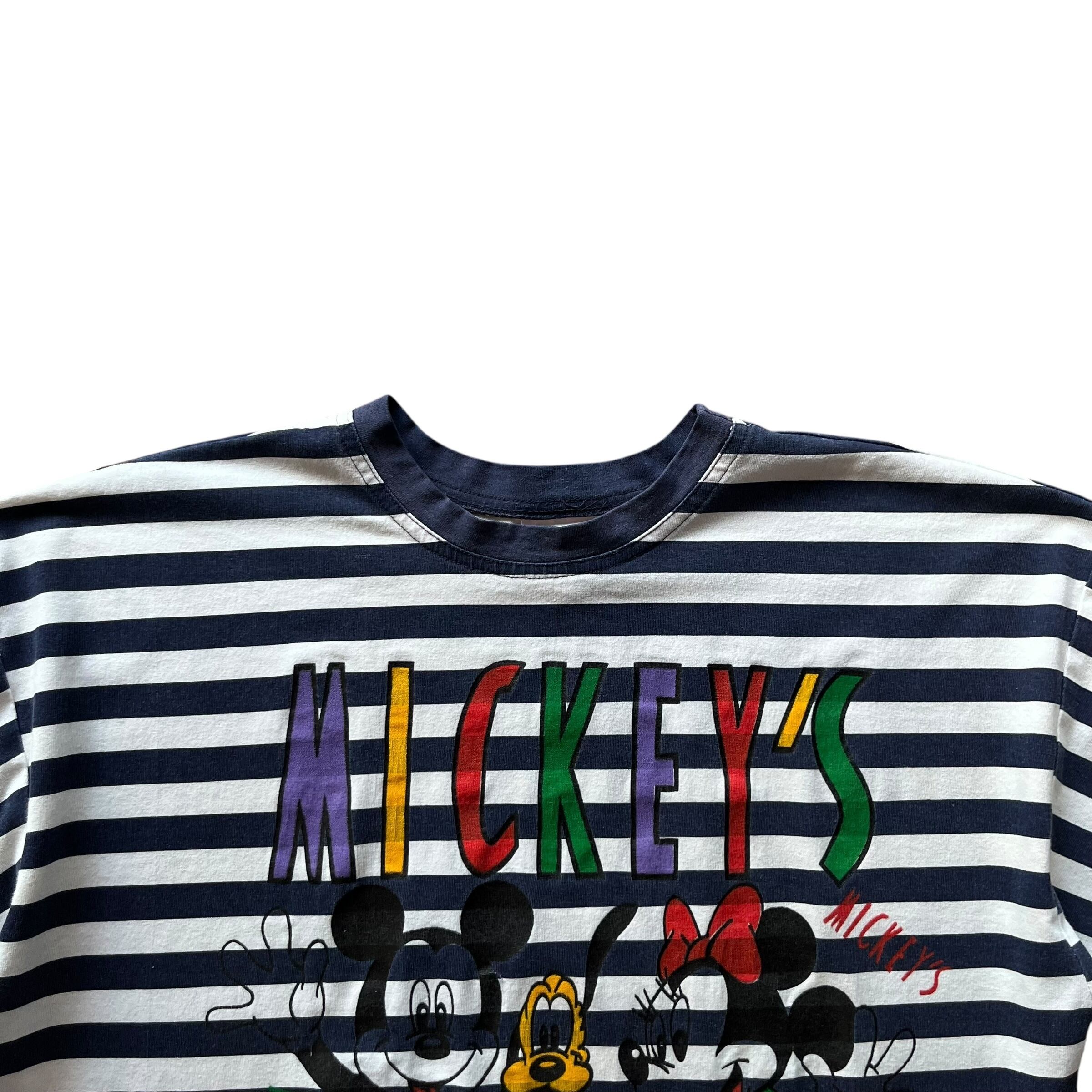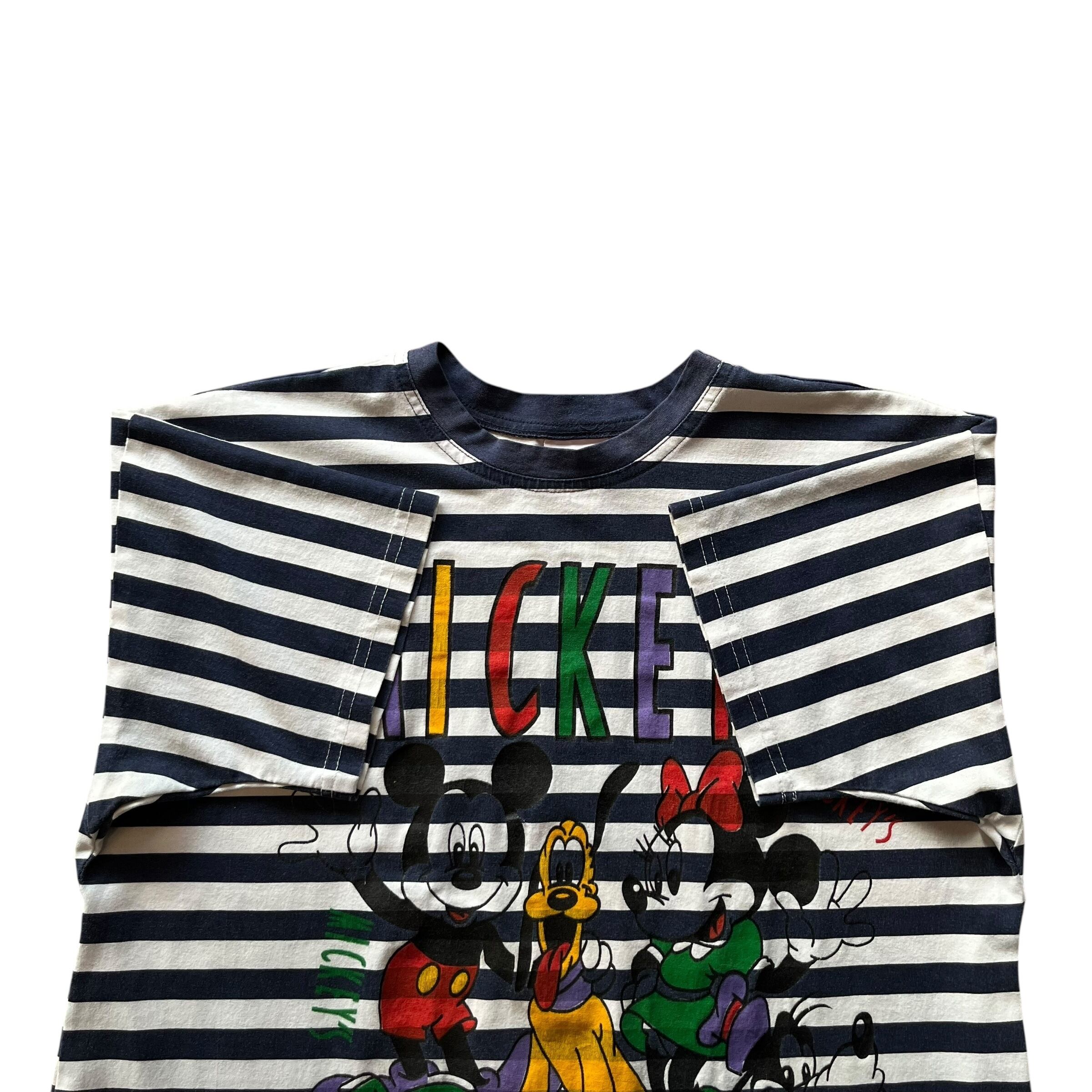 " ボーダー! " 90's〜 Old Mickey's Striped Pattern Tee Made in U.S.A. Size : About L ( White × Navy ) オールドディズニー ミッキー ミニー グーフィ プルート ディズニーランド Tシャツ 古着