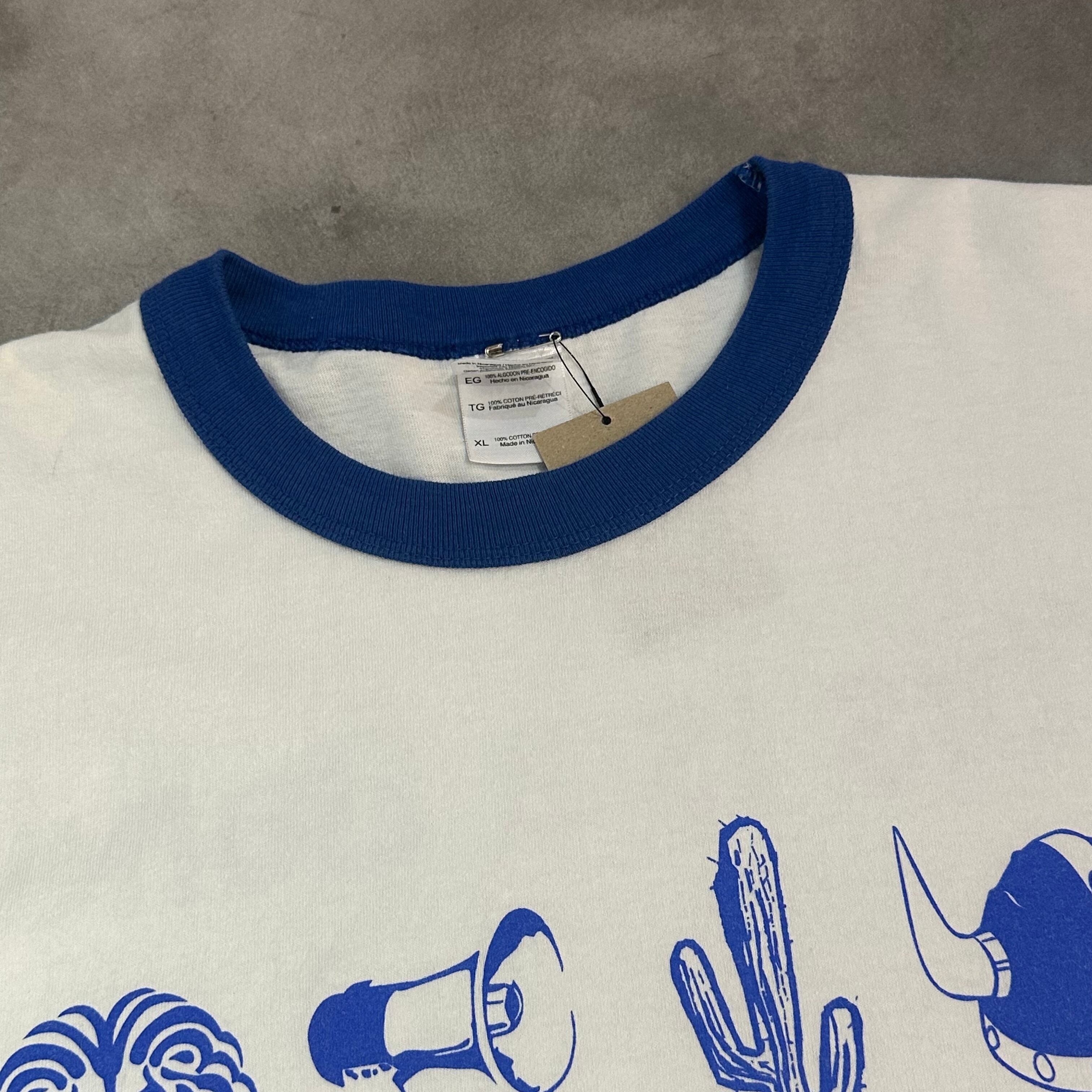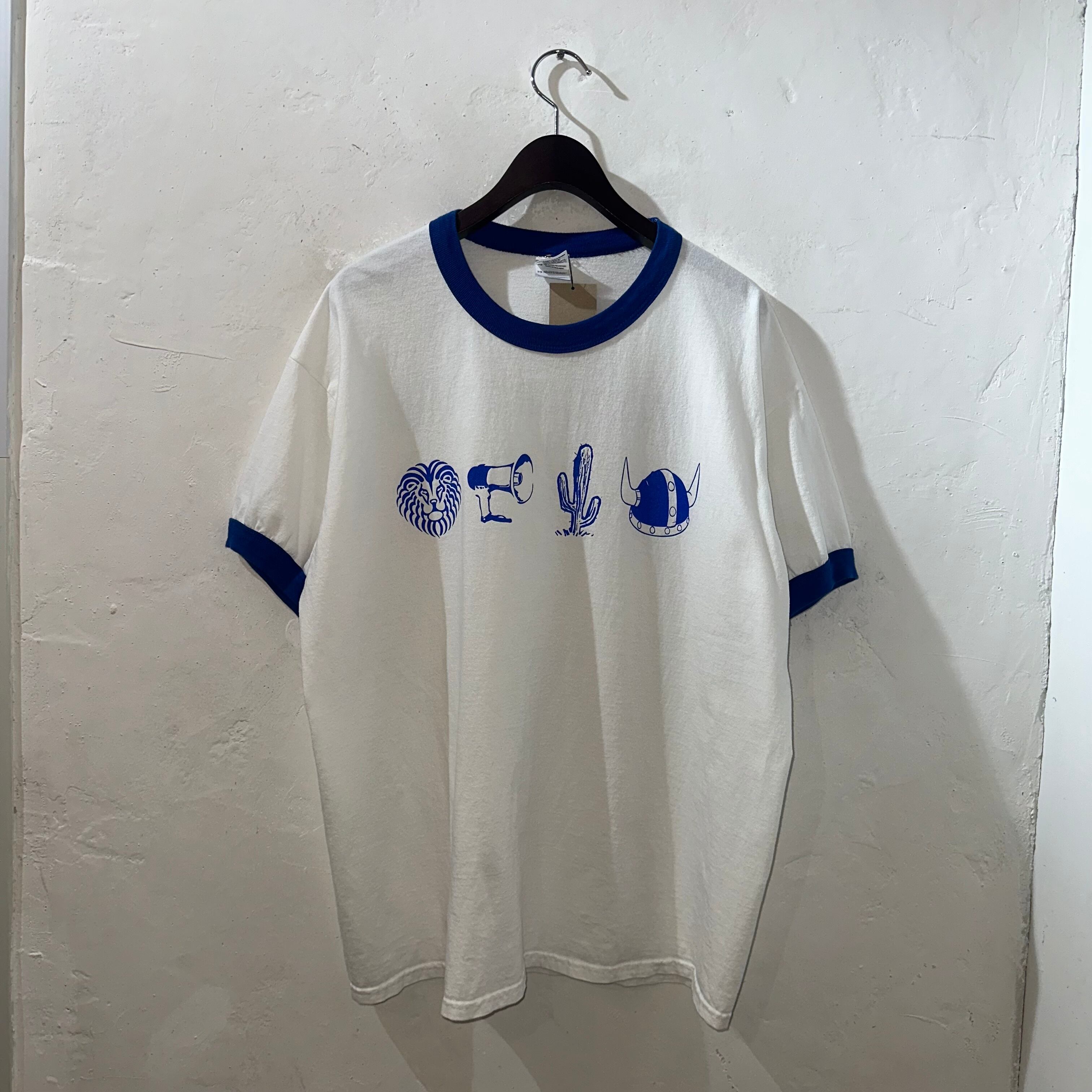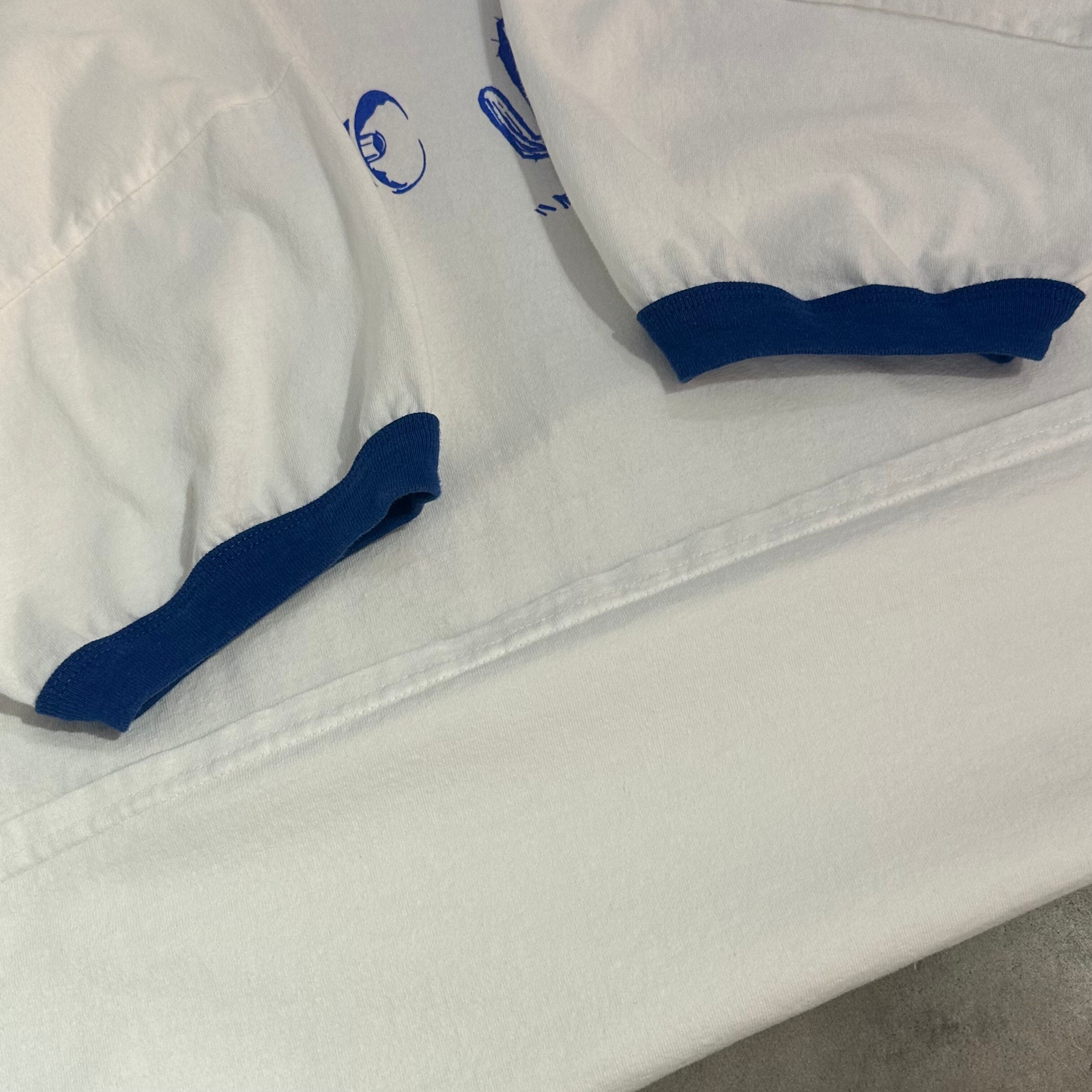 ホワイトボディにブルーのリンガー仕様で、古着らしいレトロな雰囲気とポップさを兼ね備えた仕上がり。