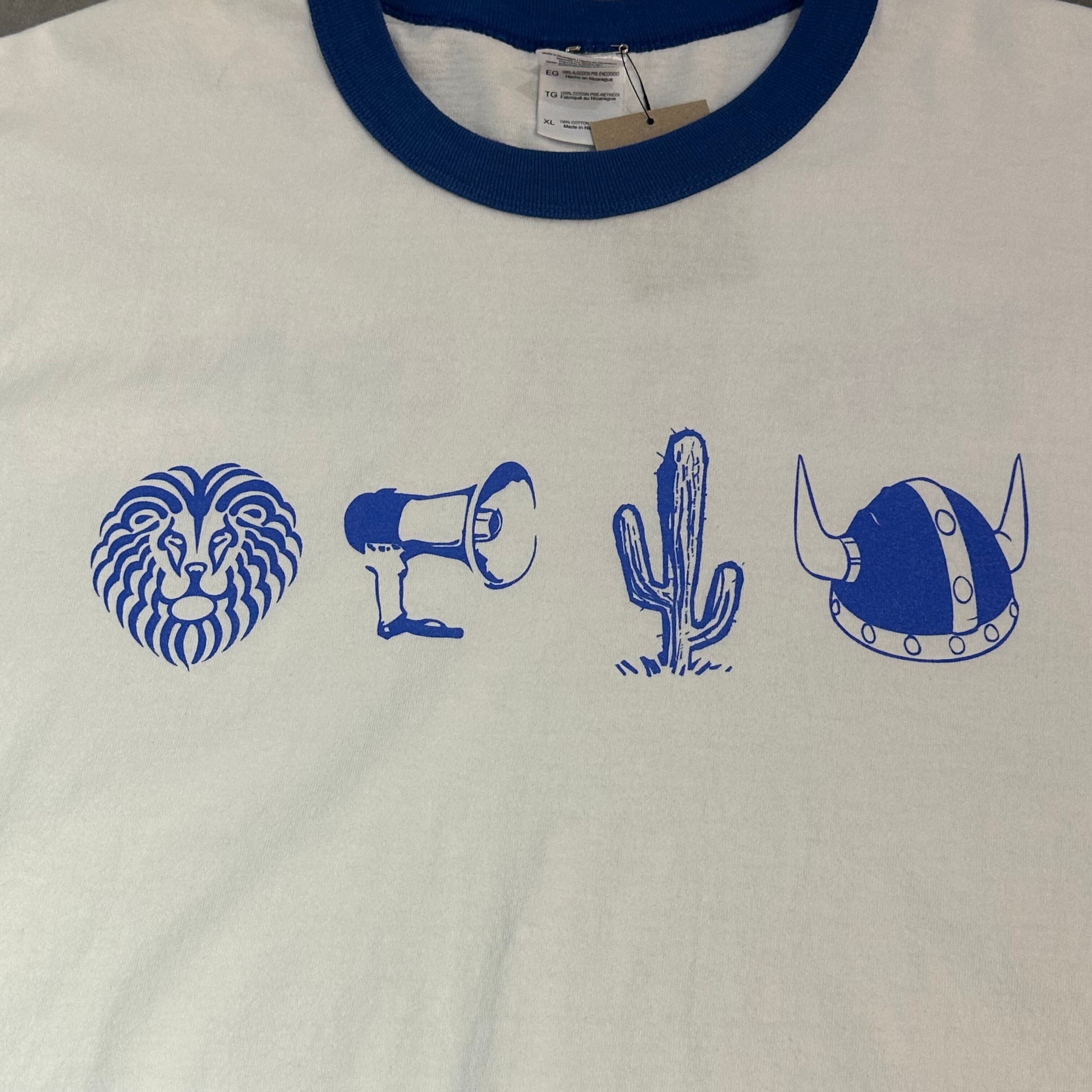 フロントにはライオン、メガホン、サボテン、バイキングヘルメットという、ちょっと不思議でユーモラスな4つのモチーフを並べたプリント。