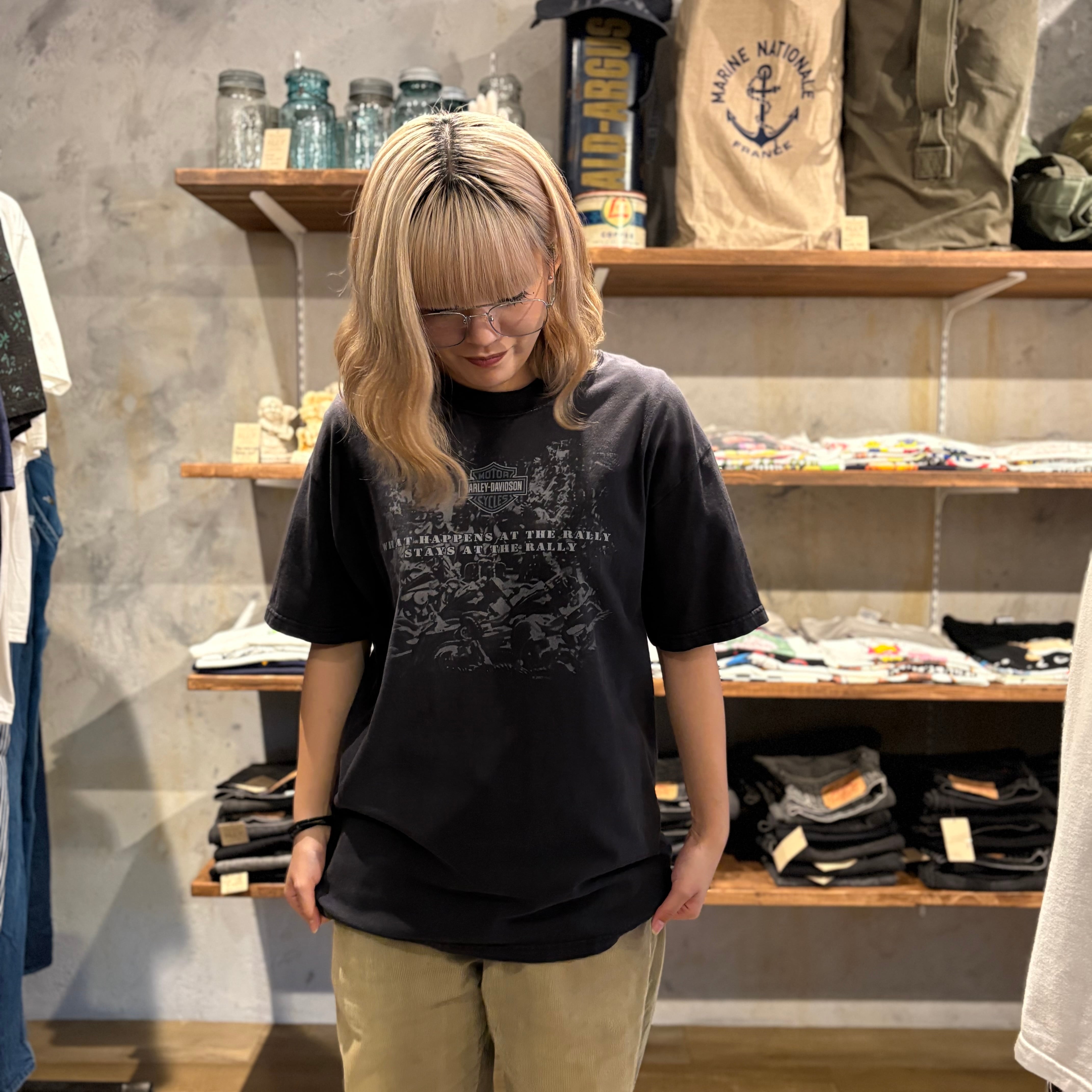 中央には定番シールドロゴと、「WHAT HAPPENS AT THE RALLY STAYS AT THE RALLY」というアメリカらしいユーモア溢れるフレーズが映える一枚。