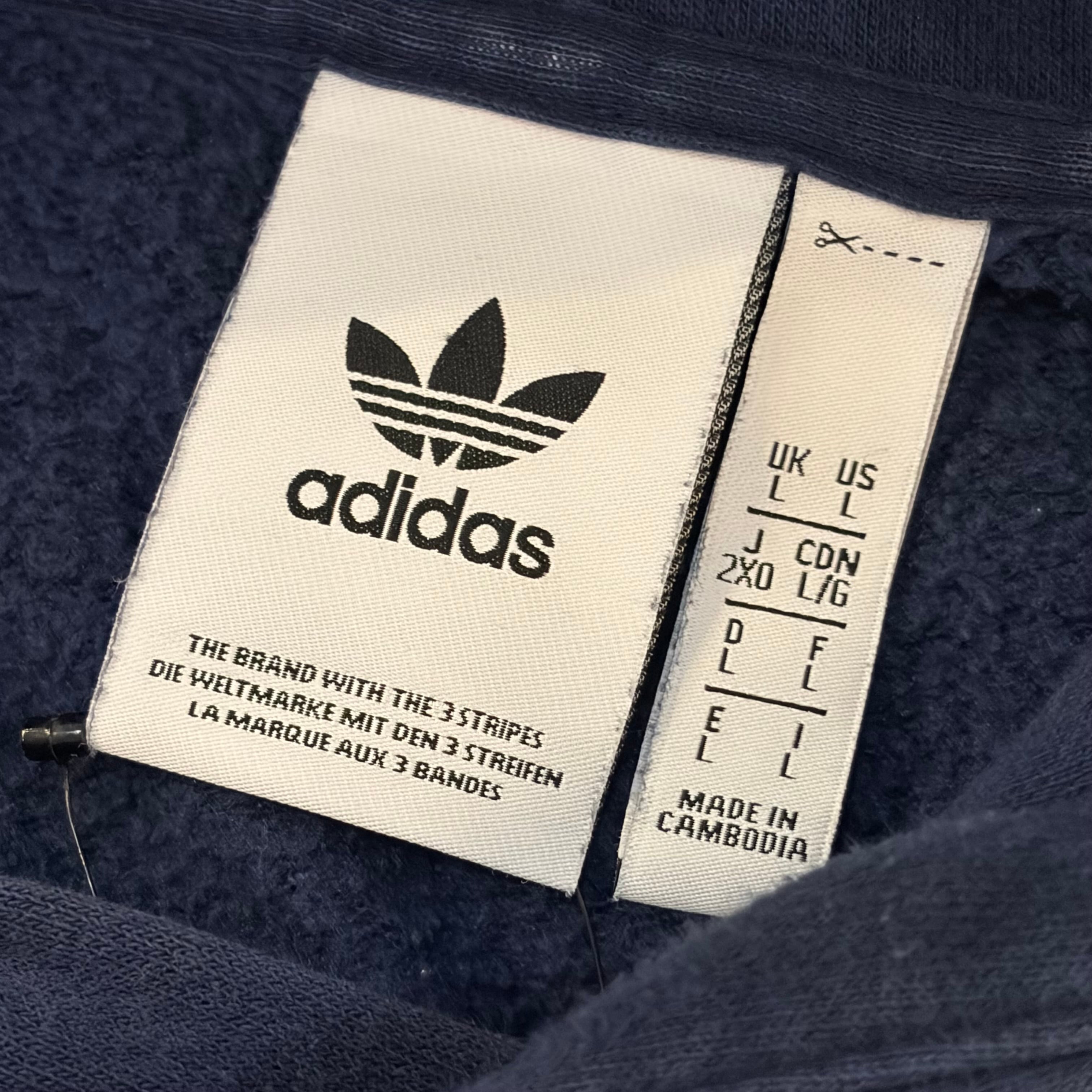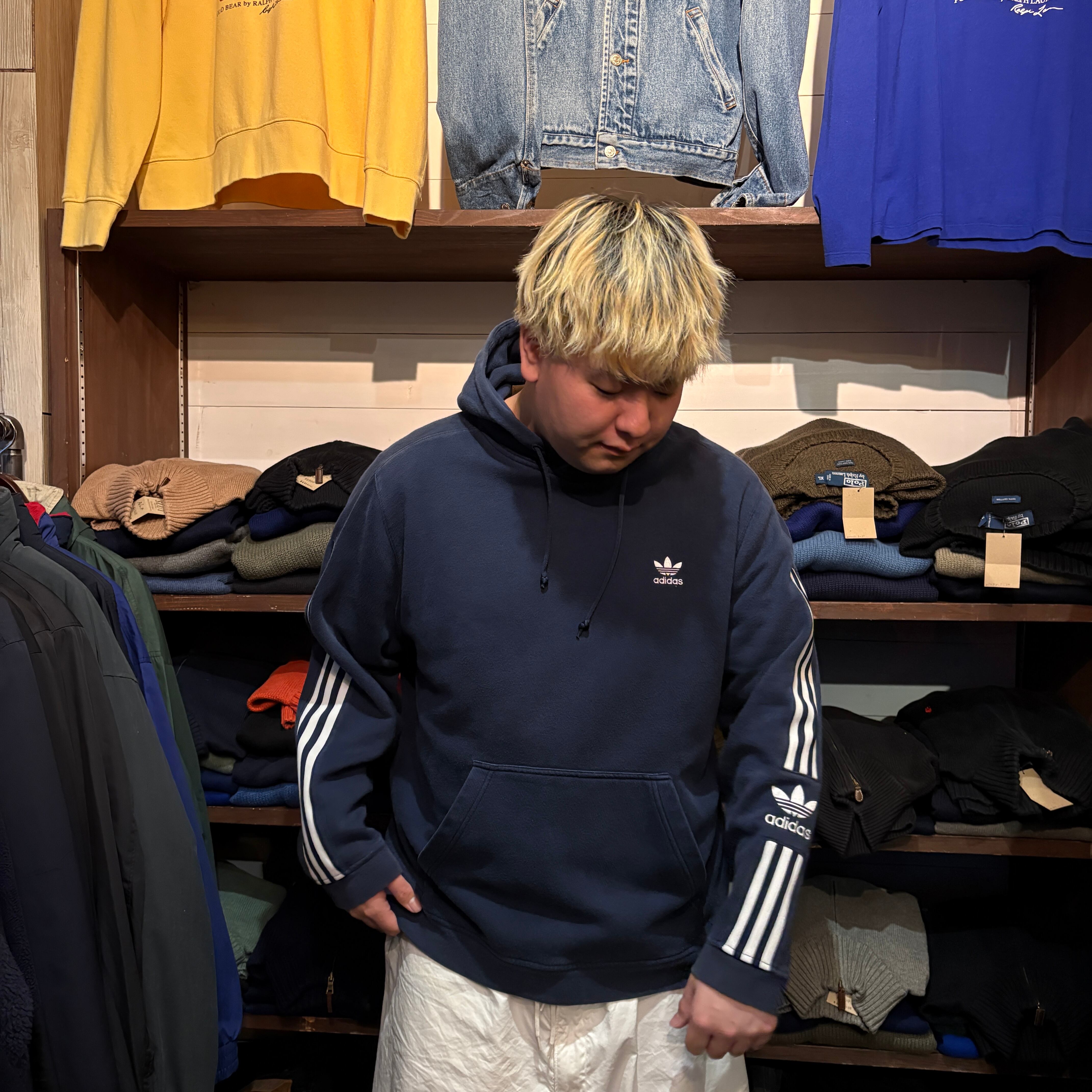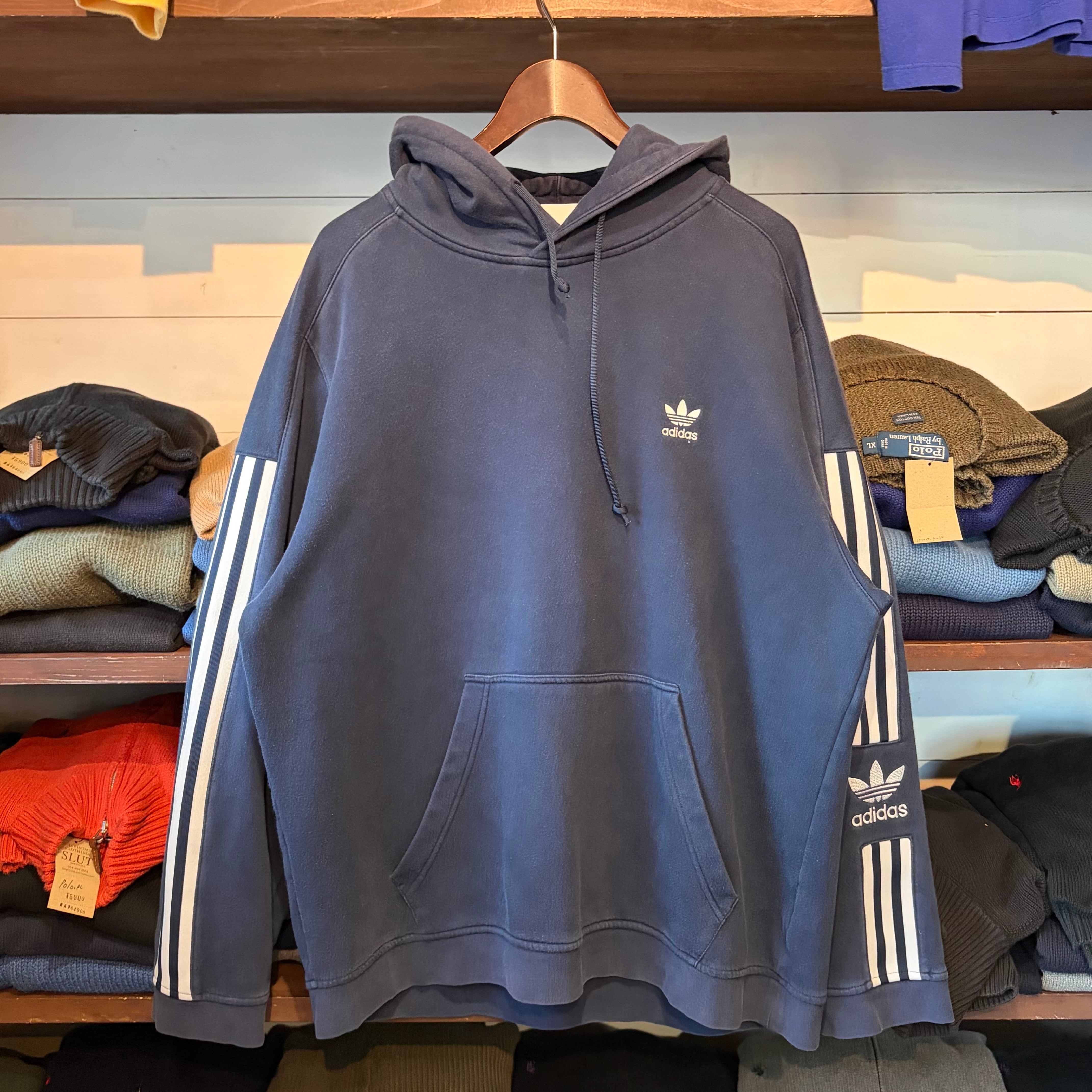 ”今っぽ◎” adidas 3 Stripe Hoodie ( Navy ) Size:L アディダス スリーストライプ パーカー スウェット トレフォイルロゴ 古着屋