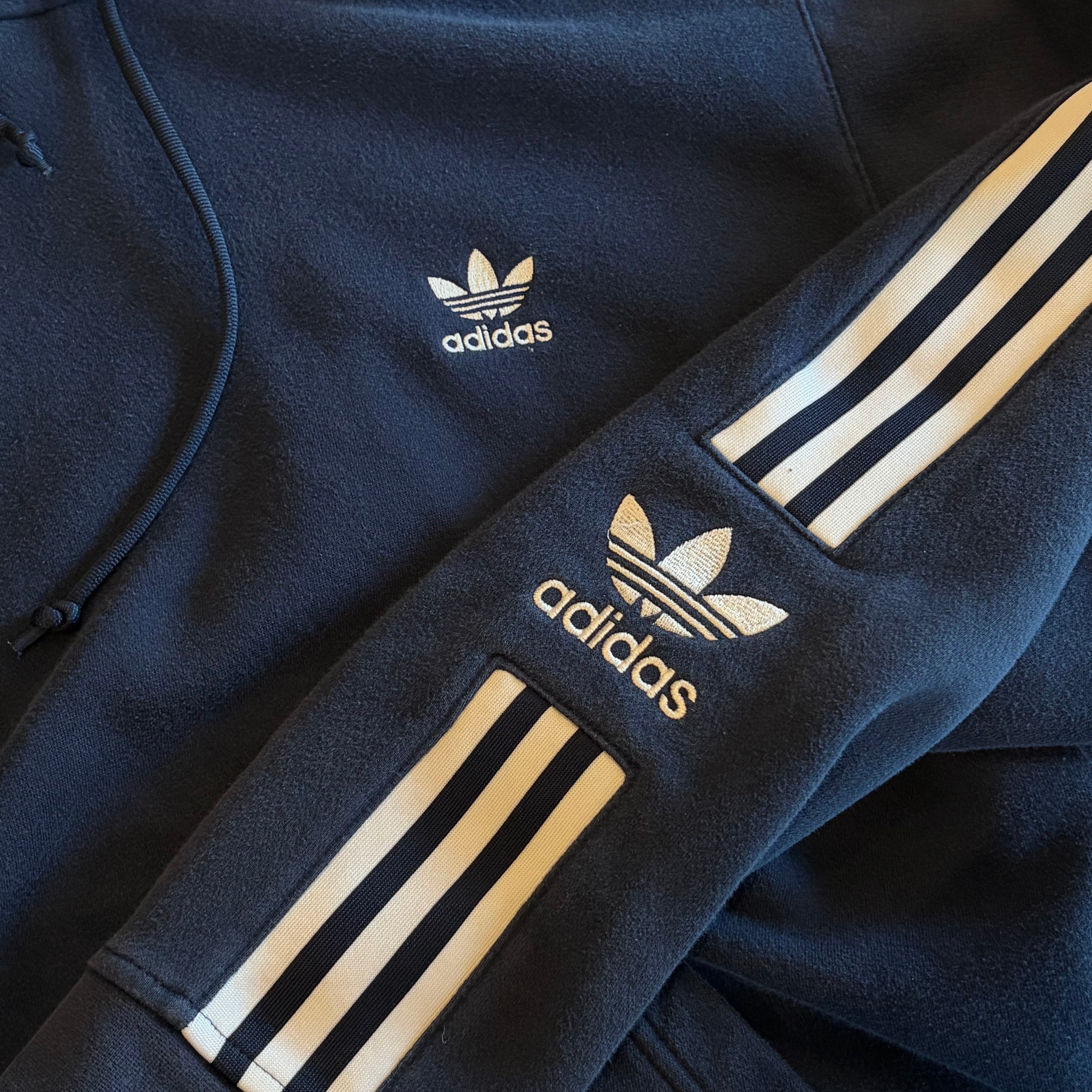 袖の3本ラインとトレフォイルロゴが映える、王道のネイビーパーカー。