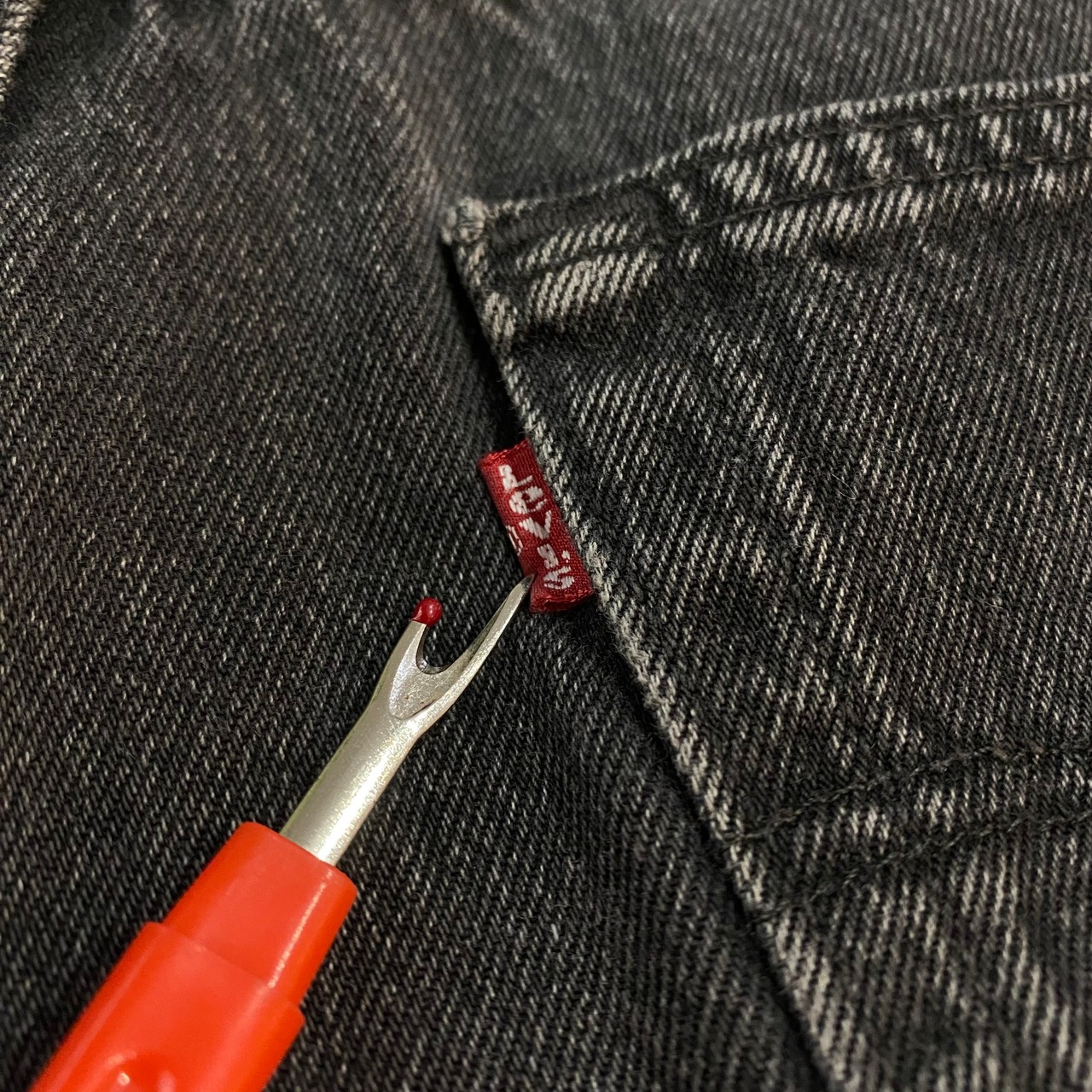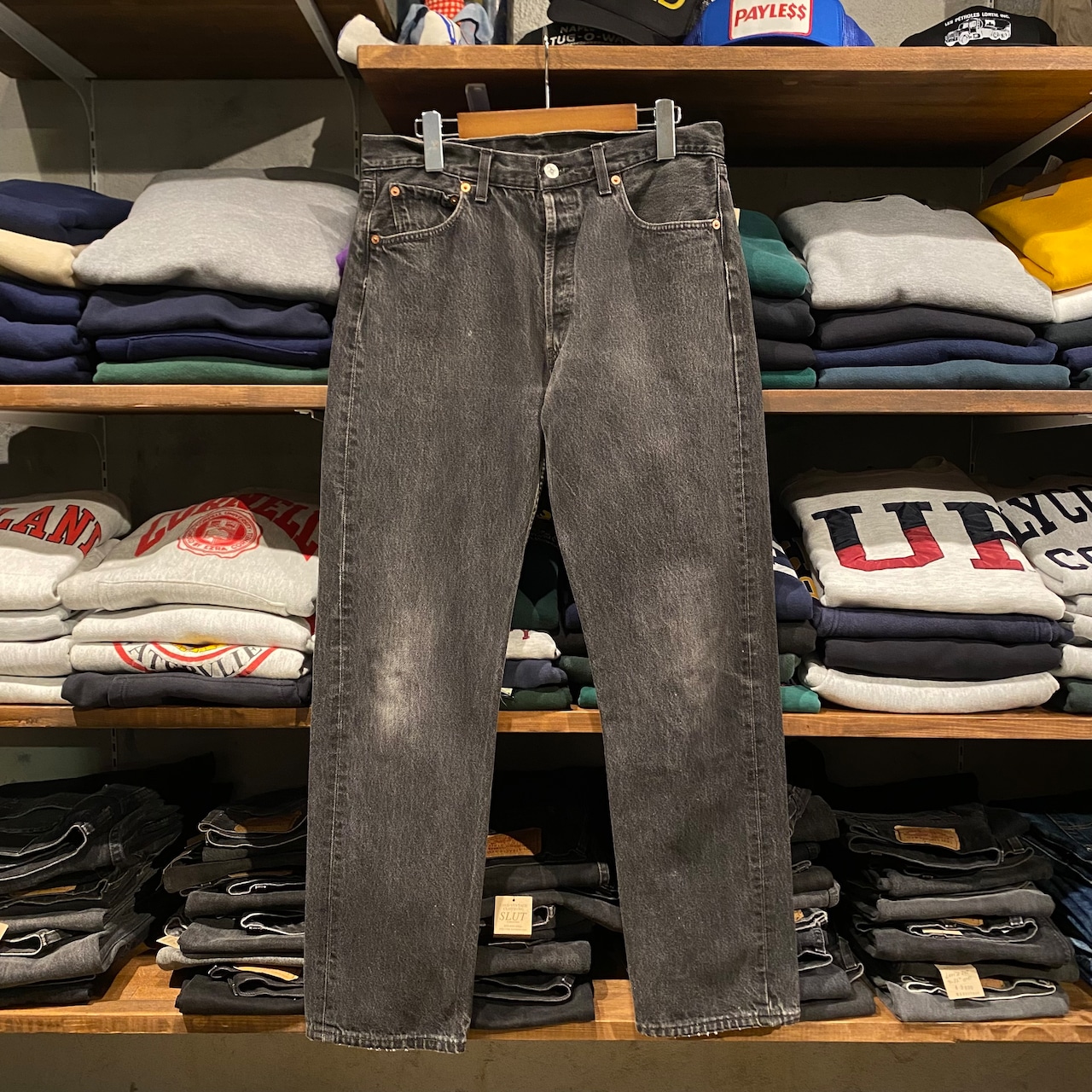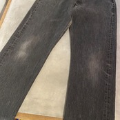 後染めならではの、マットで奥行きのあるブラックに、履き込みによって現れたムラ感・アタリが加わり、ヴィンテージらしい雰囲気を存分に感じられる一本です◎