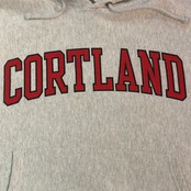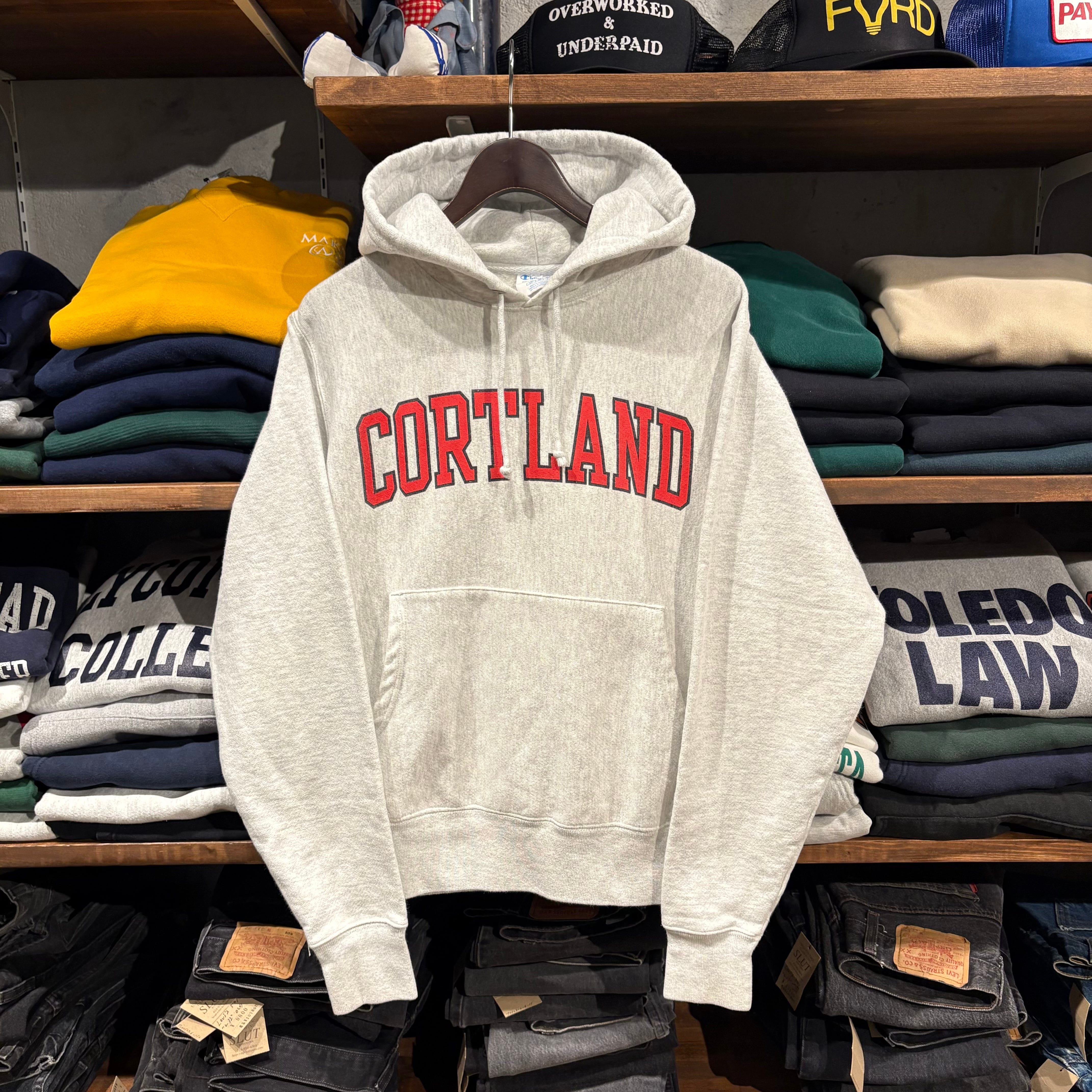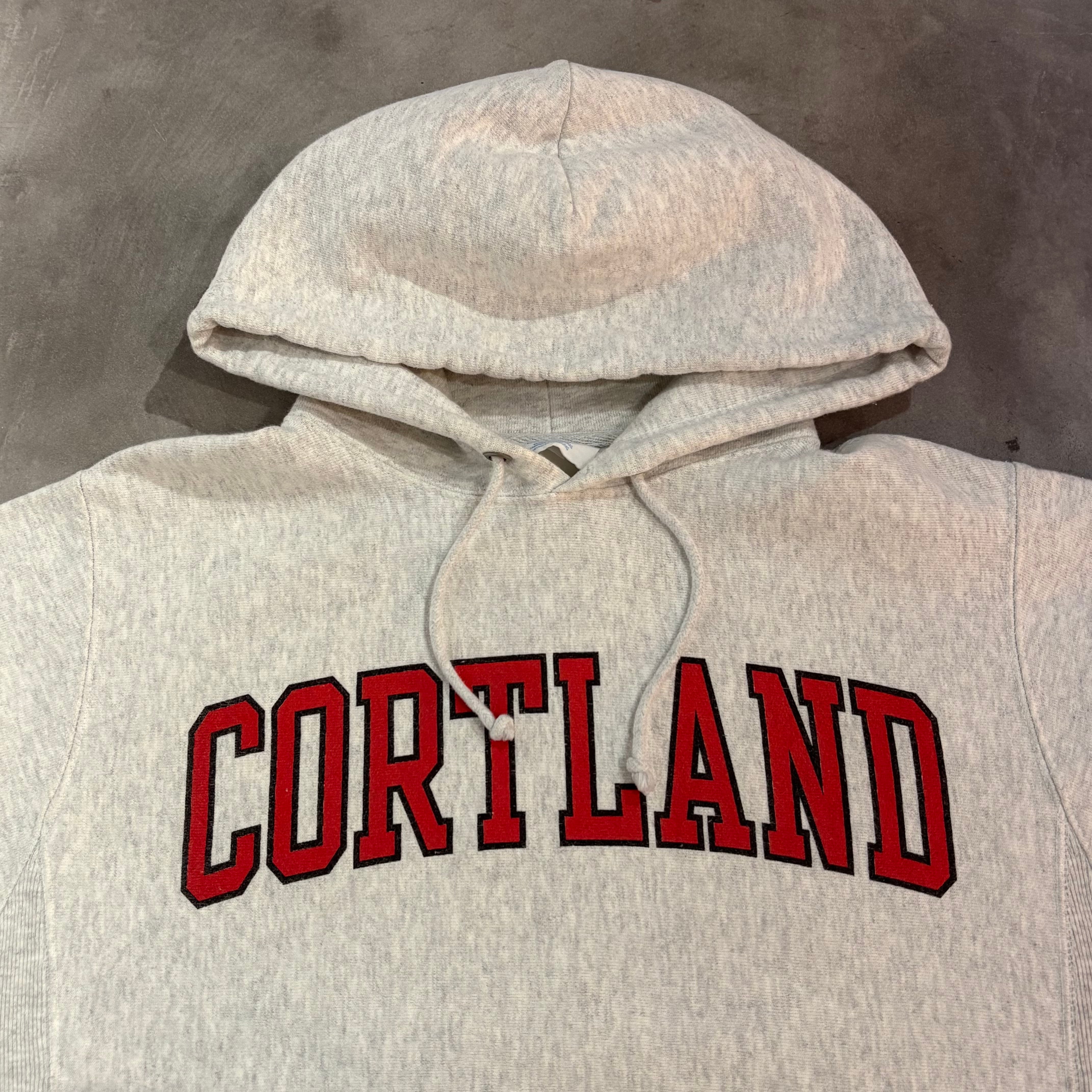 霜降りグレーボディに、フロントはレッド×ネイビー縁取りの「CORTLAND」カレッジロゴプリント。