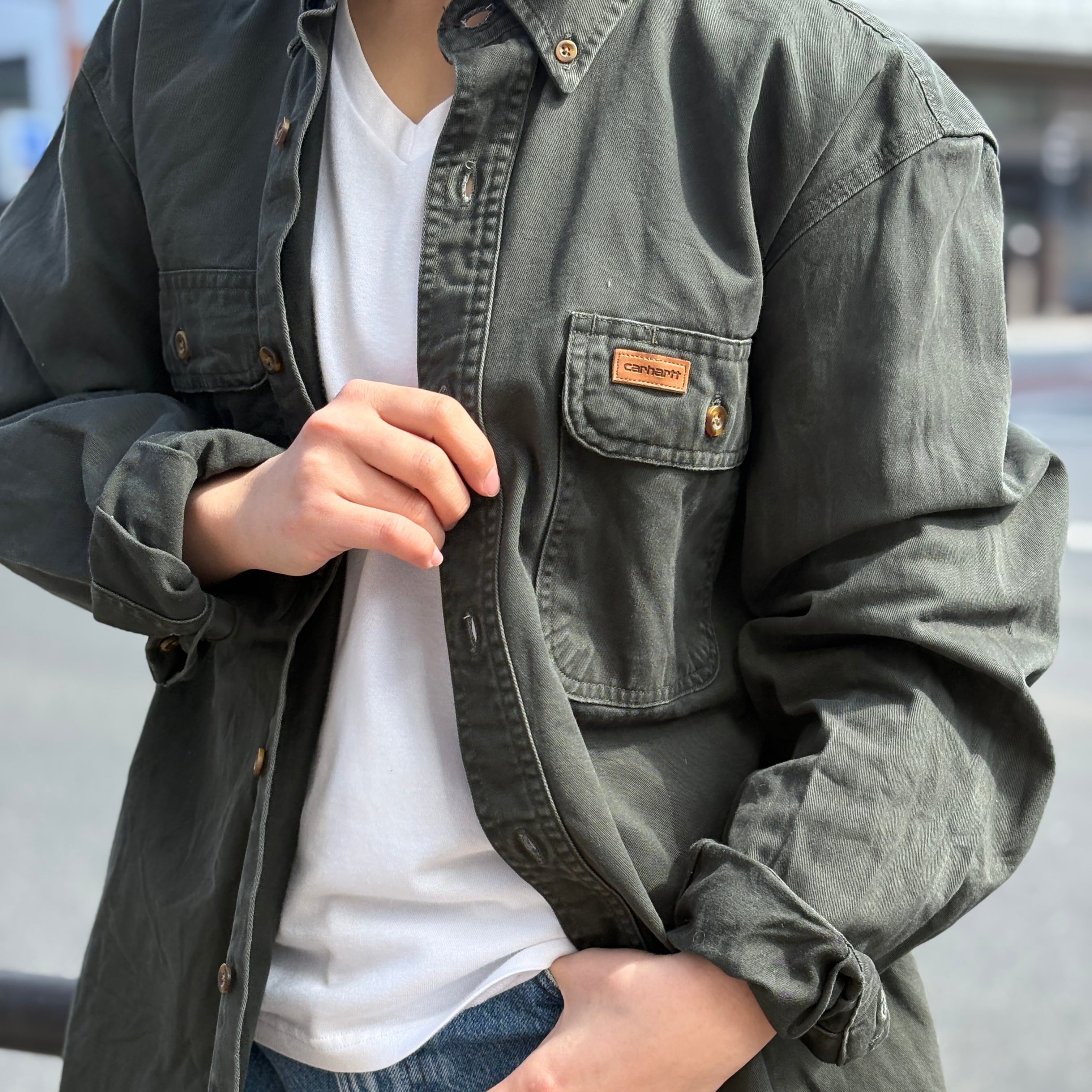 Carhartt L/S shirt (olive)”size M” カーハート 長袖シャツ ボタンダウン ストリート 古着 古着屋 郡山